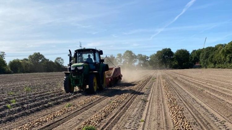 Die Kartoffelernte ist in vollem Gange. An regenfreien Tagen geht es nach dem Melken raus auf den Acker, meistens, bis es wieder dunkel wird. Der Vorroder holt die Kartoffeln aus der Erde und legt sie in einer langen Reihe wieder auf dem Boden ab. So können die Knollen ein paar Stunden trocknen, bevor der große Kartoffelroder kommt. Auf dem Roder arbeiten immer vier bis sechs fleißige Hände, die Steine, faule Knollen und manchmal eine Kröte von dem Kartoffelband absammeln. Unsere Auszubildenden Marie und Moritz wechseln sich ab, den beladenen Anhänger vom Feld auf den Hof zu fahren, wo der Weg im Kartoffellager endet.