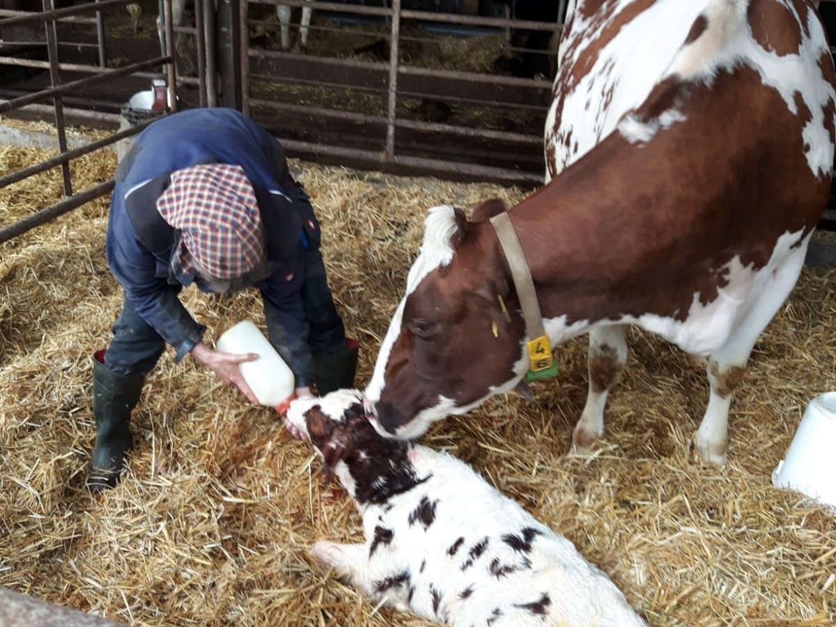 Kälber wohnen zunächst in unseren Kälberiglus, wo wir sie gut beobachten können und zweimal täglich mit warmer Milch ihrer Mütter versorgen. Dabei bekommen sie jeweils mindestens 6 Liter Milch und die Nuckeleimer bleiben hängen, sodass die Kälber, auch wenn sie zu einer späteren Zeit nochmal Hunger haben, saufen können. Nach zwei bis drei Wochen ziehen sie in unseren Kindergarten um – eine kleine Gruppe frecher Kälber. Danach sind sie alt genug für den Jungviehstall. Je nach Tier werden die Rinder mit ungefähr 16 Monaten besamt und dürfen dann für den Sommer nochmal auf die Weide.